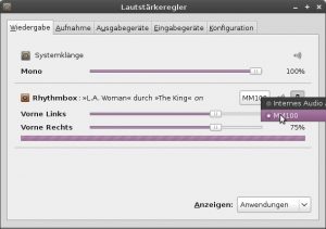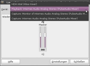 Now we have to configure the sound system. In Gome menu go to “Applications -> Multimedia” and select the “pulseaudio volume control”. Change the device to the correct “PulseAudio Mixer” (sorry, all screenshots in German…):