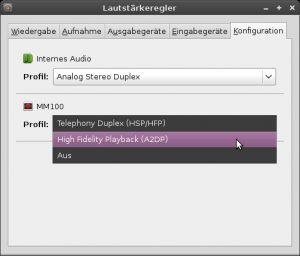 Next open the mixer by clicking on Gnome’s mixer applet and choosing “Open volume control”. Go to the “Configuration” tab where you should see your newly paired bluetooth headset. Change it’s profile to “High Fidelity Playback (A2DP)” and keep the window open:
