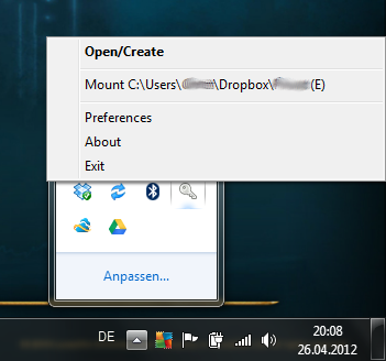 Choose “Open/Create” to import your Dropbox\mystuff folder and type your password. From there on you can simply mount your encrypted folder by selecting the “Mount …” option. Also look into “Preferences” as this will let you autostart encfsw.exe.