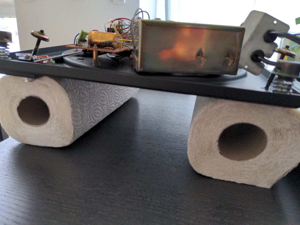 Now you’d be ready to remove everything from the chassis. However in order to have access to the mechanical and and electronic parts you’ll have to turn it around. I placed two rolls of paper towels beneath the side where the turntable would sit, being VERY careful not put any pressure on anything near the tonearm or movable parts. The whole setup looked like this then: