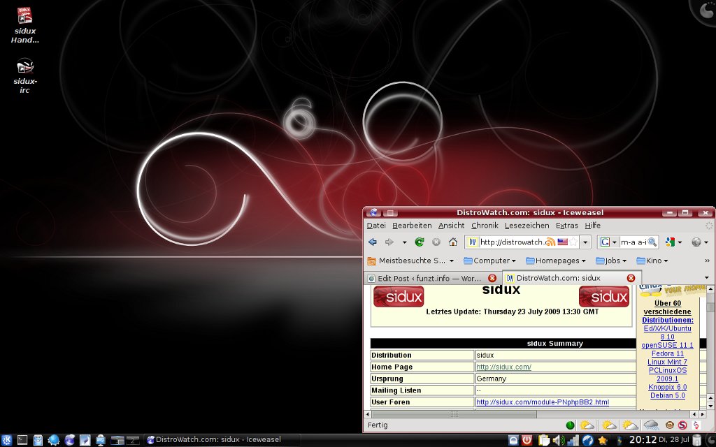 On July 15th sidux 2009.2 was released. I was looking forward to this release because it’s the first one with KDE4 and I didn’t wanted to go through the hassle of updating from KDE3… For those who haven’t heard of sidux: it’s a Debian sid (the unstable branch of Debian) based distro and 100% compatible with Debian sid. In fact it uses sid’s repositories together with sidux’ own repositories. The latter provide bugfixes to some broken packages in sid, sidux artwork, some tools unique to sidux and of course the sidux kernel (which might update quite frequently). sidux has a rolling release cycle which means, you may update to each next “release” by just updating through Debian’s apt-get. As the homepage says: sidux is “Debian hot and spicy!”. But most of all it makes running the unstable Debian sid quite stable.