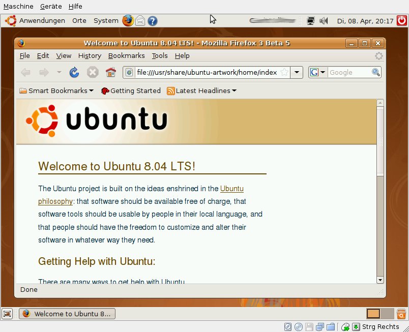 It isn’t for long, until the new Ubuntu Linux “Hardy Heron” will be released. Time for me to have at least a short look at it and provide some screenshots. So I installed both Ubuntu and Kubuntu as virtual machines using VirtualBox. Kubuntu will come with two flavors: one with KDE3 and long term support (LTS) like the Ubuntu version and one with KDE4 and I guess without LTS. KDE4 is still missing some apps and sometimes has some minor issues with stability. Anyway, of course I chose Kubuntu with KDE4.