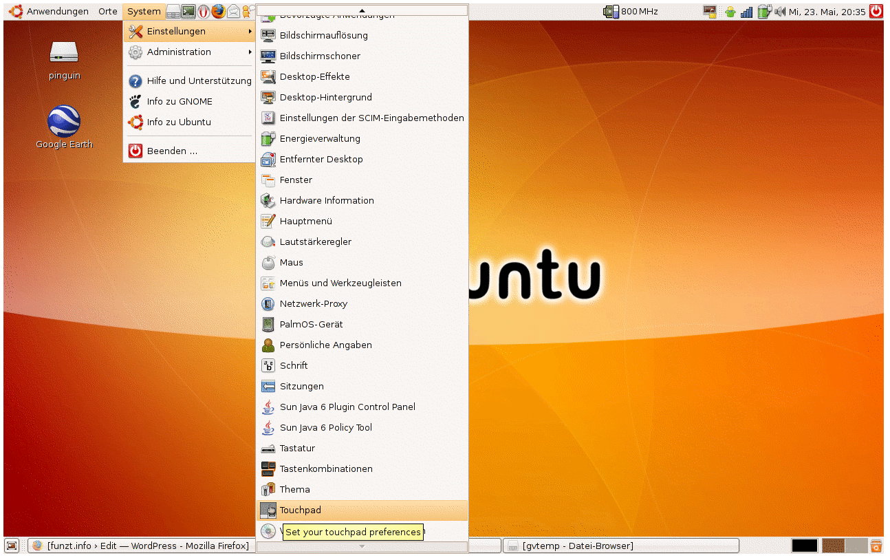 One of the first things I turned off is the “tapping” ability of the touchpad, because it made me doubleclick on nearly every entry of the Gnome menu just by passing it. The other thing we want to fix, of course, is the screen resolution. The native resolution of the display would be 1280x800. Ubuntu makes this very easy for us. Open Synaptic package manager or install by command line: